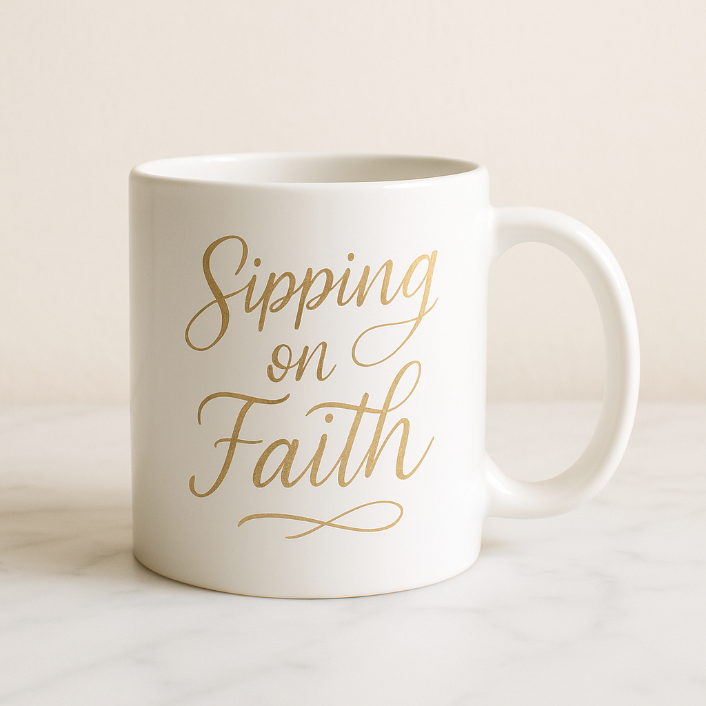 Sipping on Faith – Gold Script Ceramic Mug (11, 15oz)